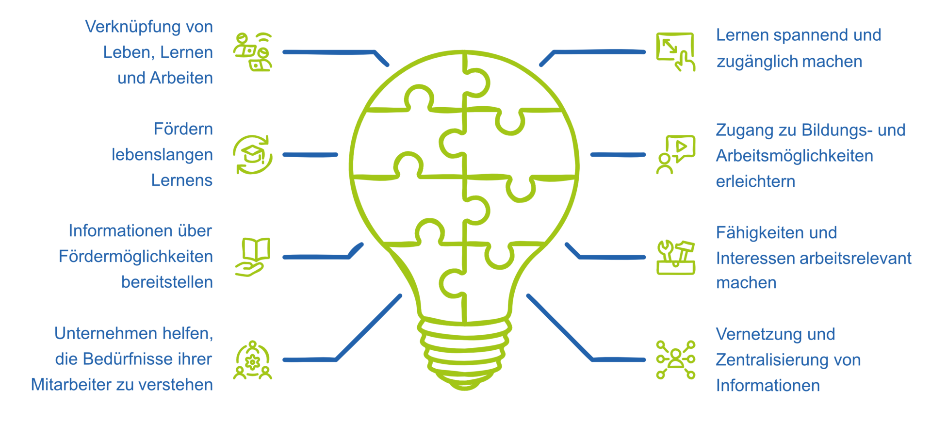 Wir vernetzen und zentralisieren Informationen zu Lern- und Arbeitsmöglichkeiten.