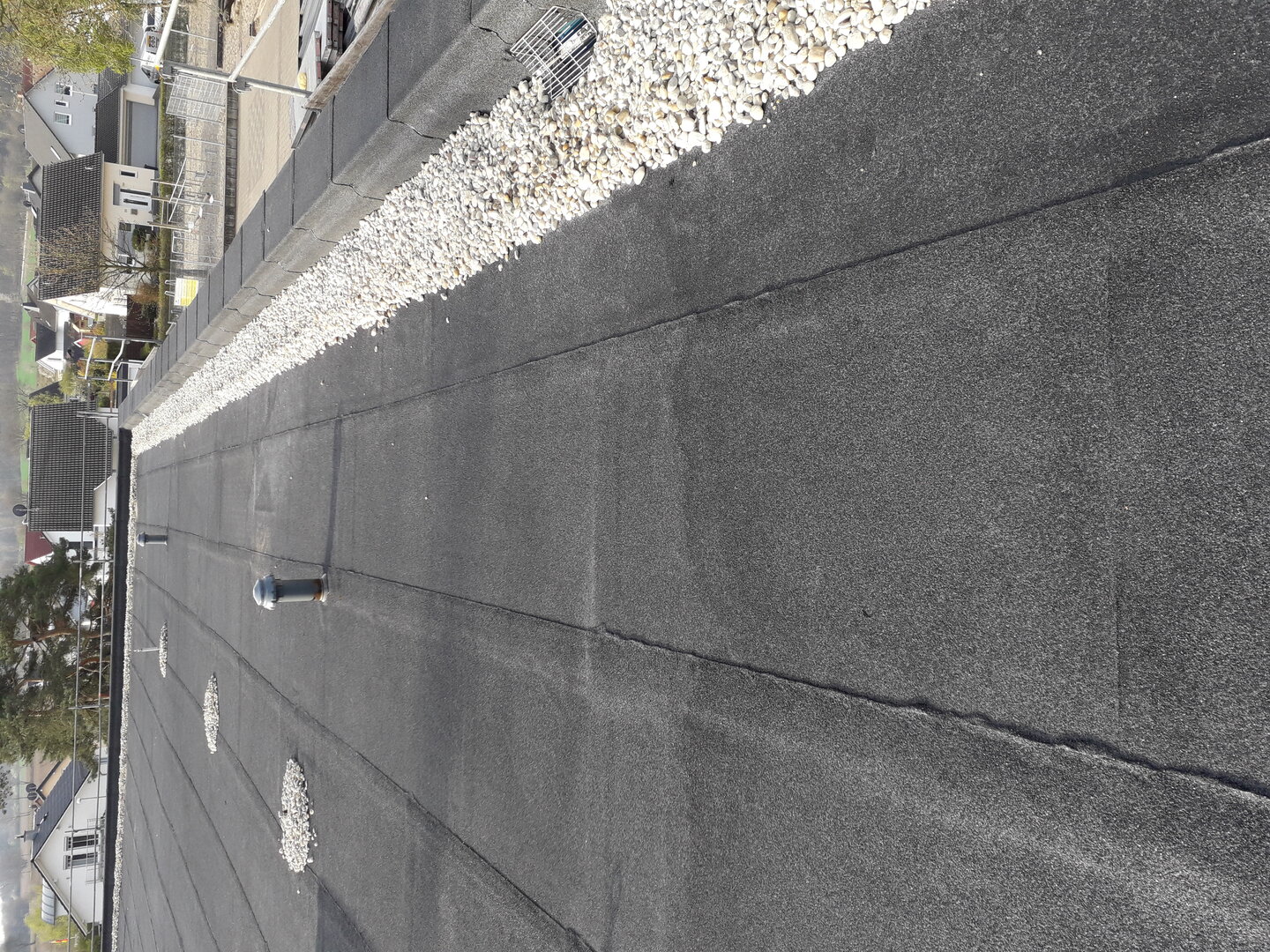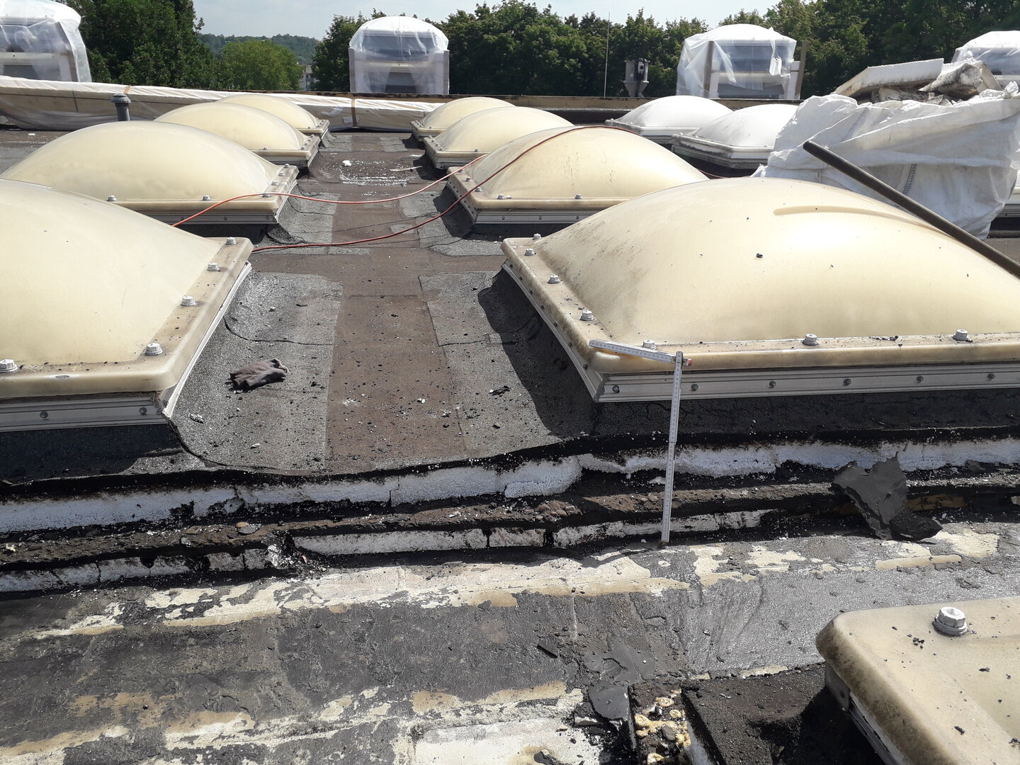Beide Flachdächer zeigten starke Undichtigkeiten auf. Des Weiteren wiesen die vorhandenen Dachaufbauten energetische Mängel auf. Die vorhandene Wärmedämmung war durchfeuchtet und erfüllte dadurch ihre Funktion nicht mehr. Die vorhandene Flachdacheindeckung aus Bitumenabdichtung mit Kiesauflage einschließlich der vorhandenen ungenügenden Wärmedämmung und der bestehenden Lichtkuppeln war nicht zu erhalten.