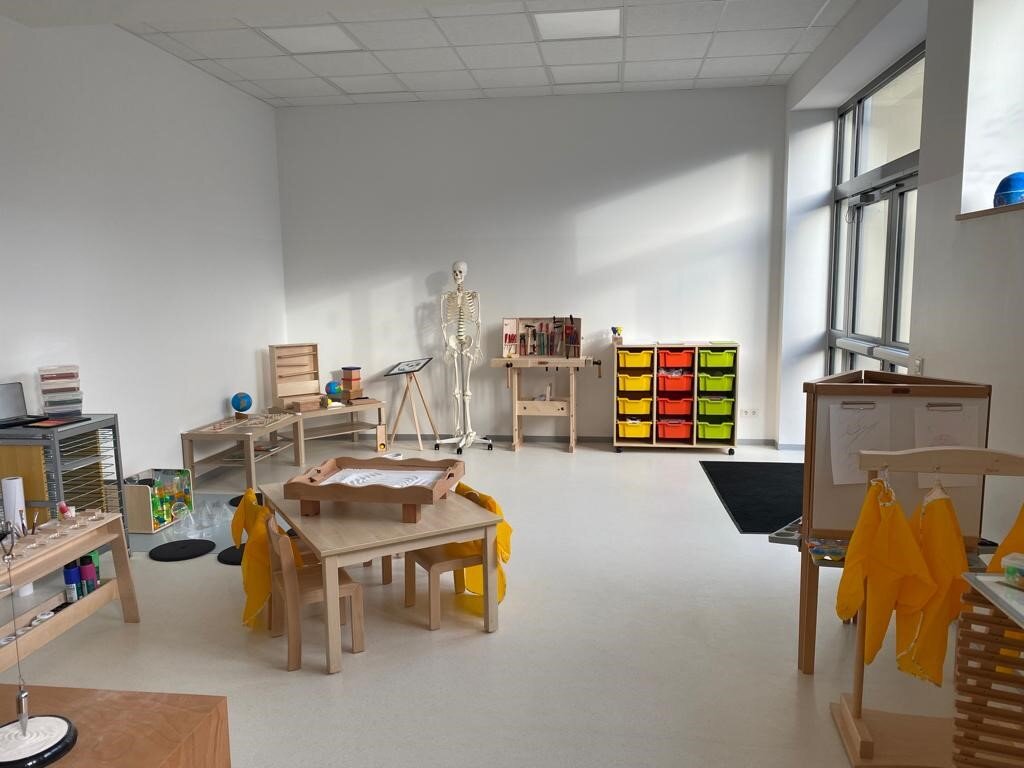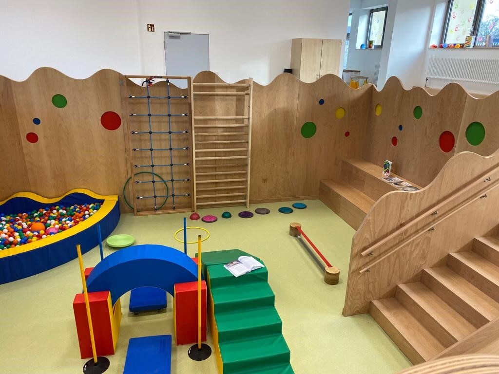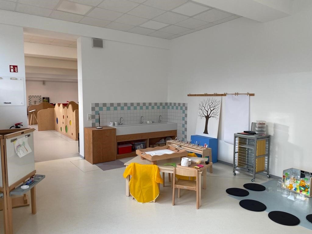 Das ehemalige und seit Jahren außer Betrieb genommene Lehrschwimmbad im UG der Schulturnhalle wurde für die Ausbildung angehender Erzieherinnen und Erzieher mit sieben „Bildungsinseln“ ausgebaut.