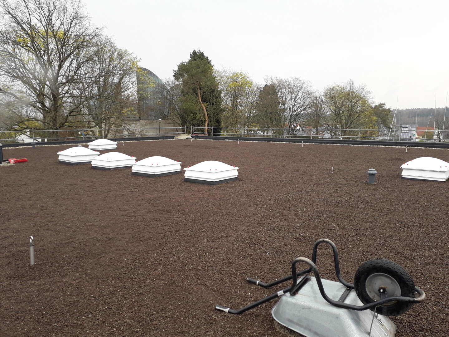 Die Gebäude des sanierten Flachdachs stammen aus dem Baujahr 1965. Die Unterhaltung der Flachdächer wurde durch häufige Reparaturen immer aufwändiger. Auf den Flachdächern zeigten sich insbesondere im Bereich der Gebäudefugen Undichtigkeiten. Der winterliche als auch der sommerliche Wärmeschutz war durch die lediglich 5 cm Dämmauflage als unzureichend anzusehen. Die neue Dachdämmung ist nach aktueller ENEV ausgelegt. Die bestehende, abgängige und undichte Dachabdichtung aus Bitumen wurde vollflächig abgebrochen. Es wurde anschließend eine Wärmedämmung aufgebracht und eine neue bituminöse Dachabdichtung hergestellt. Zusätzlich wurde eine neue Attika hergestellt und auf der neuen Dachabdichtung wurde eine extensive Dachbegrünung aufgebracht.