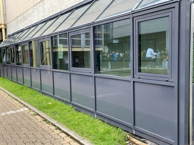 Das Robert-Schuman-Gymnasium Saarlouis setzt sich aus mehreren Gebäuden verschiedener Baujahre zusammen. Die Turnhallenfenster sowie das Haupteingangselement stammen noch aus dem Baujahr ca. 1930-er und sind dementsprechend sehr marode, teilweise nicht mehr verkehrssicher und wurden bereits durch das Anbringen von Verschraubungen mehrmals gesichert. Aus diesem Grund war das Öffnen nicht mehr möglich und somit die Lüftungsfunktion nicht mehr gegeben.