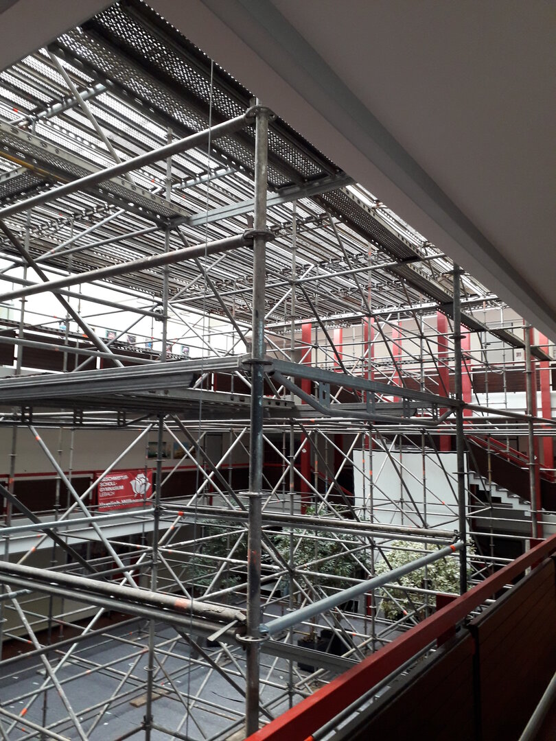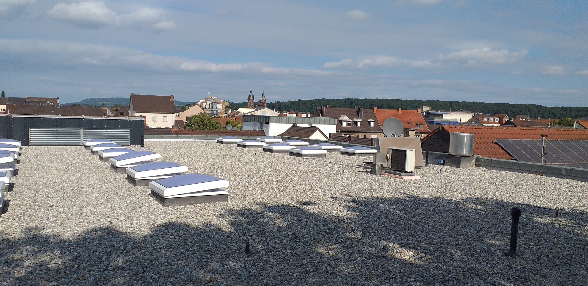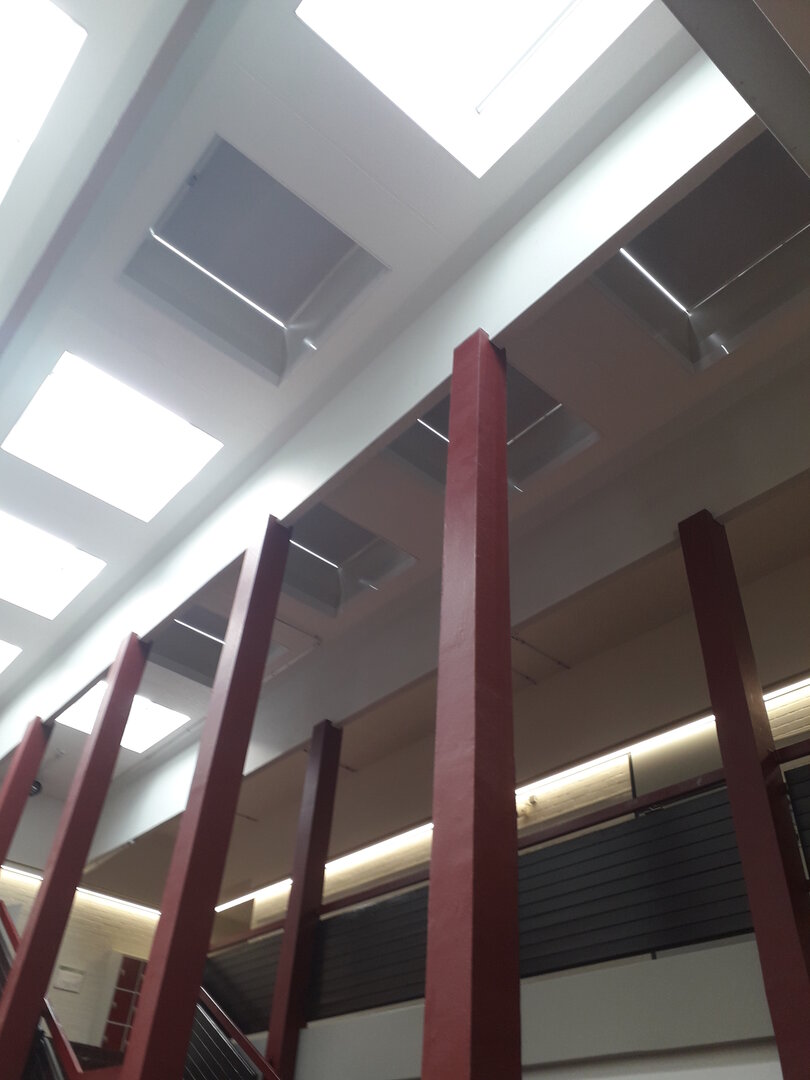Der 1. Bauabschnitt der Flachdachsanierung wurde bereits 2018 nach den Maßgaben der aktuellen EneV durchgeführt. Mit der Ausführung des 2. BA der Flachdachsanierung im zentralen Atriumsbereich mit einer Fläche von ca. 440m² wurden auch 40 Lichtkuppeln (davon 8 Lichtkuppeln zur Gebäudelüftung und auch als Rauch-Wärme-Abzug RWA zu öffnen) ausgetauscht.