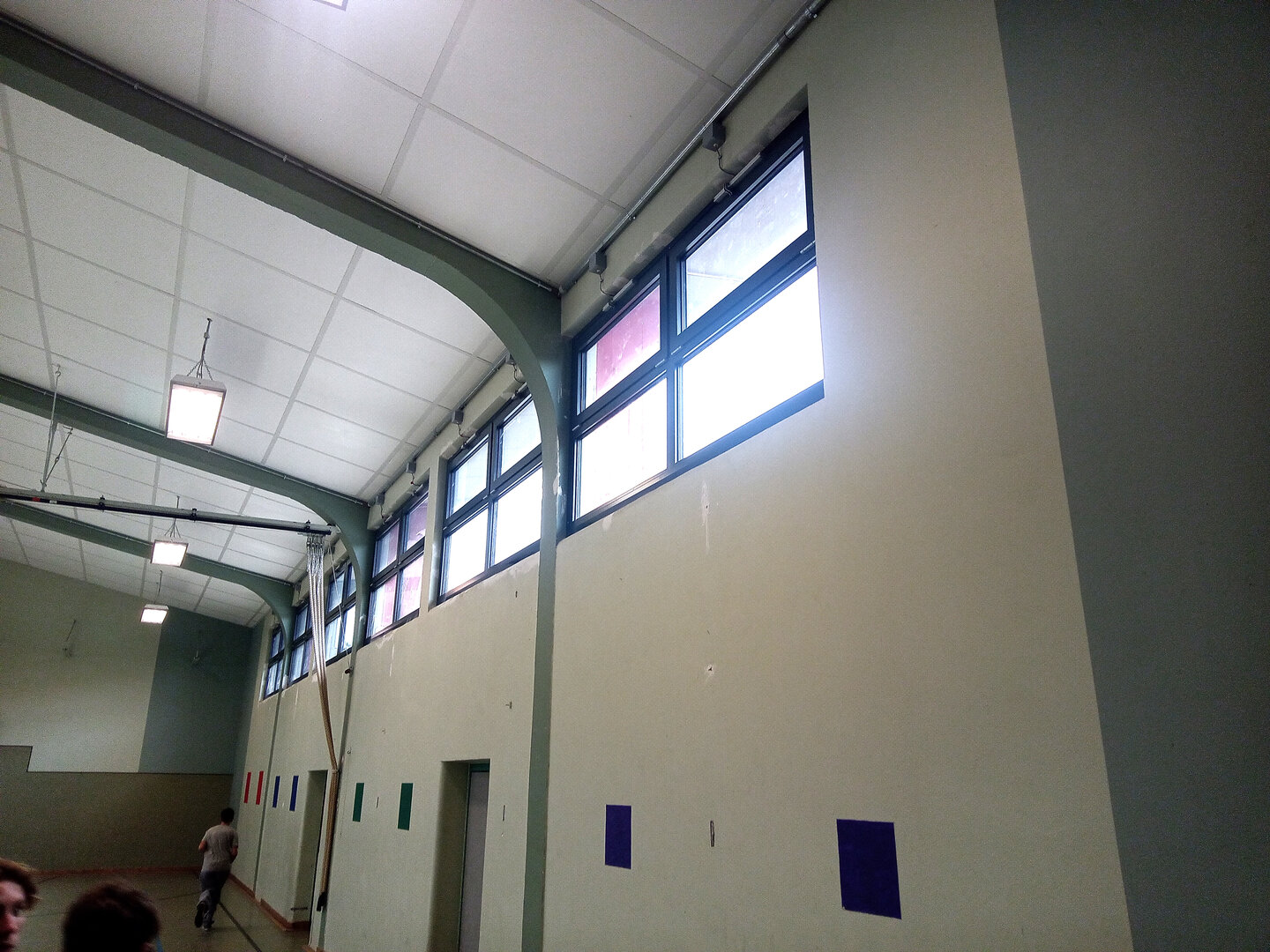 Im mittleren 1., 3. und 5. Feld wurden zu Lüftungszwecken Lamellenfenster eingebaut. Die Öffnung der Lamellenfenster erfolgt mittels Elektroantrieben. Das 2. und 4. mittlere Feld wird durch je einen waagerechten Riegel symmetrisch in 4 Scheibenfelder geteilt und fest verglast. Das dreiteilige Fenster an der Nordseite wurde durch ein ebenfalls dreiteiliges Fenster mit zwei elektrisch zu öffnenden Drehflügeln und einer mittleren Festverglasung ersetzt.