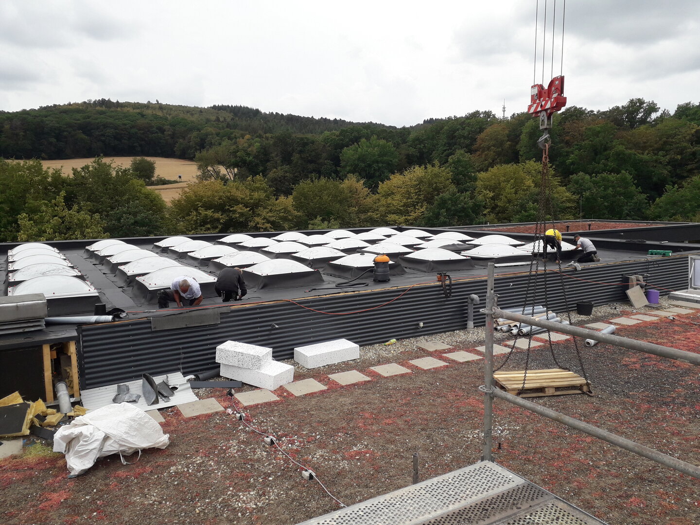 Aus diesen Gründen beschloss man, das Dach unter Berücksichtigung der aktuellen energetischen und technischen Richtlinien komplett zu erneuern. Gegenstand der Arbeiten war die Sanierung des Flachdachs mit Verkleidung der Attika. Bei der Flachdachsanierungsmaßnahme wurde der vorhandene Flachdachaufbau bis auf die Rohdecke abgerissen und durch eine mehrschichtige Dacheindeckung mit Wärmedämmung ersetzt. Im Zuge der Arbeiten wurden auch die alten Lichtkuppeln erneuert, der Blitzschutz auf den aktuellen Stand der Technik gebracht und eine Flachdachabsturzsicherung montiert.