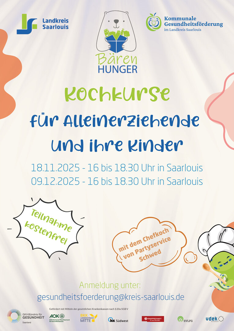 Die Kommunale Gesundheitsförderung des Landkreises Saarlouis lädt Alleinerziehende und ihre Kinder in der Herbst- und Vorweihnachtszeit zu gemeinsamen Kochkursen nach Saarlouis ein. In Kooperation mit dem Partyservice Schwed werden gemeinschaftlich gesunde Speisen zubereitet und verkostet. Im Mittelpunkt stehen alltagstaugliche Gerichte, praktische Tipps und der Austausch in entspannter Atmosphäre.