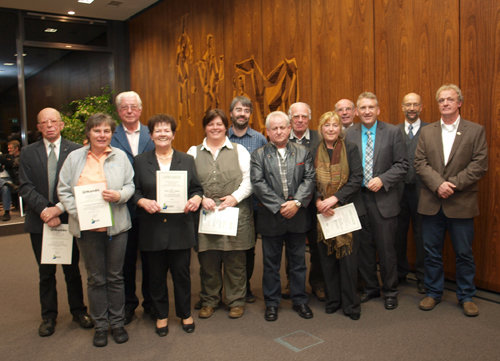 Ulrich Heintz, Jörg Dietrich und Landrat Patrik Lauer (v.r.) mit den Kreisumweltpreisträgern und Berwerbern von 2012.