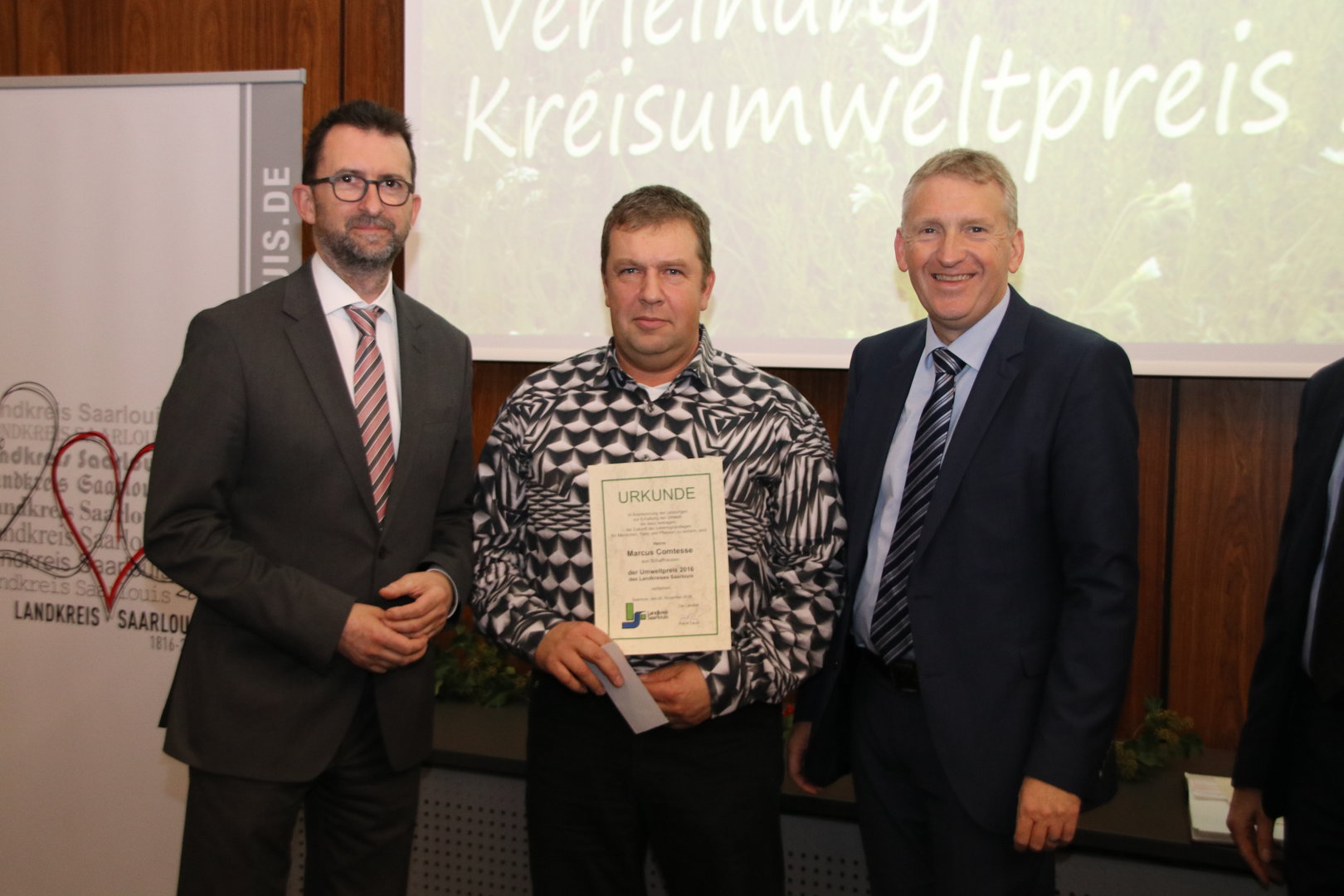 Vier Hektar mit natürlich bepflanzten Ackerrandstreifen dienen als Blühfläche für zehn bis zwölf unterschiedliche Pflanzenarten. Als Bienenweide und Nahrungsquelle für heimische Insekten ein wichtiger Standort für ökologische Nachhaltigkeit, befand der Kreistag. „Landwirtschaft hat nicht nur eine ökonomische sondern immer auch eine ökologische Dimension“, lobte auch Laudator und Umweltminister Reinhold Jost bei der feierlichen Preisverleihung. Mit 700 Euro wurde der zweite Platz ausgezeichnet und vergeben an das Ehepaar Lydia und Berthold Forse aus Hemmersdorf. Ihre artenreiche Naturblühwiese mit Streuobst, Bienenstand und einer reichen Insektenfauna überzeugte die Jury ebenfalls. Gabriele Hornsteiner aus Roden mit ihrem naturnahen Hausgarten in einer Siedlung freute sich über die Auszeichnung mit dem dritten Platz und den damit verbundenen 400 Euro. Ebenso mit dem dritten Platz ausgezeichnet wurden Ina, Max, Emil und Dr. Martin Wörner aus Piesbach. Für ihre großflächige Naturblühwiese im eigenen Naturerlebnisgarten hat die Familie bei der Auswahl des Saatguts besonders auf die Ansprüche von (Wild-)Bienen und Schmetterlingen geachtet. „Aber letztlich sind alle Bewerber große Vorbilder“, betonte Landrat Patrik Lauer. Alle Teilnehmer erhielten deshalb von Landrat und Minister eine Urkunde als Auszeichnung sowie das aktuelle Buch „Naturparadiese Saarland“ über die Natura-2000-Schutzgebiete des Saarlandes.