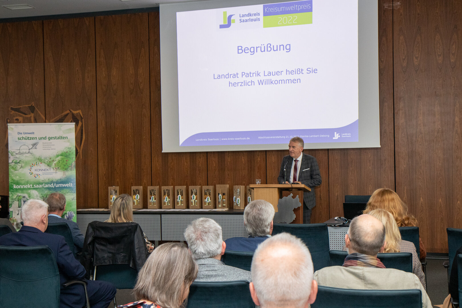 Nach der Würdigung aller Teilnehmerinnen und Teilnehmer des diesjährigen Wettbewerbes war es Zeit für die eigentliche Preisverleihung: Die Kreisumweltpreis_2022Landrat Patrik Lauer begrüßt die Anwesenden zur Verleihung des 34. Kreisumweltpreises. Foto: Yannick Hoen Landkreis Saarlouis Siegerurkunden überreichte Petra Berg, Ministerin für Umwelt, Klima, Mobilität, Agrar und Verbraucherschutz, gemeinsam mit Claudia Beck, Kreisbeigeordnete und Vorsitzende des Kreisauschusses für Umwelt, Klimaschutz, Tourismus und Landwirtschaft, und Landrat Patrik Lauer. Claudia Beck zufolge hatte die Jury bei beiden Siegerbetrieben „gespürt, dass die umweltfreundliche und nachhaltige Ausrichtung von der Geschäftsführung mit viel Herzblut gelebt und von den Firmen in den Vordergrund gestellt wird“. Beide Unternehmen hatten zudem „in besonderer Weise die dargestellten Bewertungskriterien erfüllt“. Deshalb habe sich die Jury einstimmig darauf geeinigt, einen gemeinsamen ersten Platz zu vergeben. Saar-Umweltministerin Petra Berg schloss sich mit Lorbeeren für die Preisträger an. Klima- und Umweltschutz könne nur dann gelingen, wenn das Thema Nachhaltigkeit auch in den Köpfen ankomme. Dabei würden Unternehmen wie die Preisträger helfen.