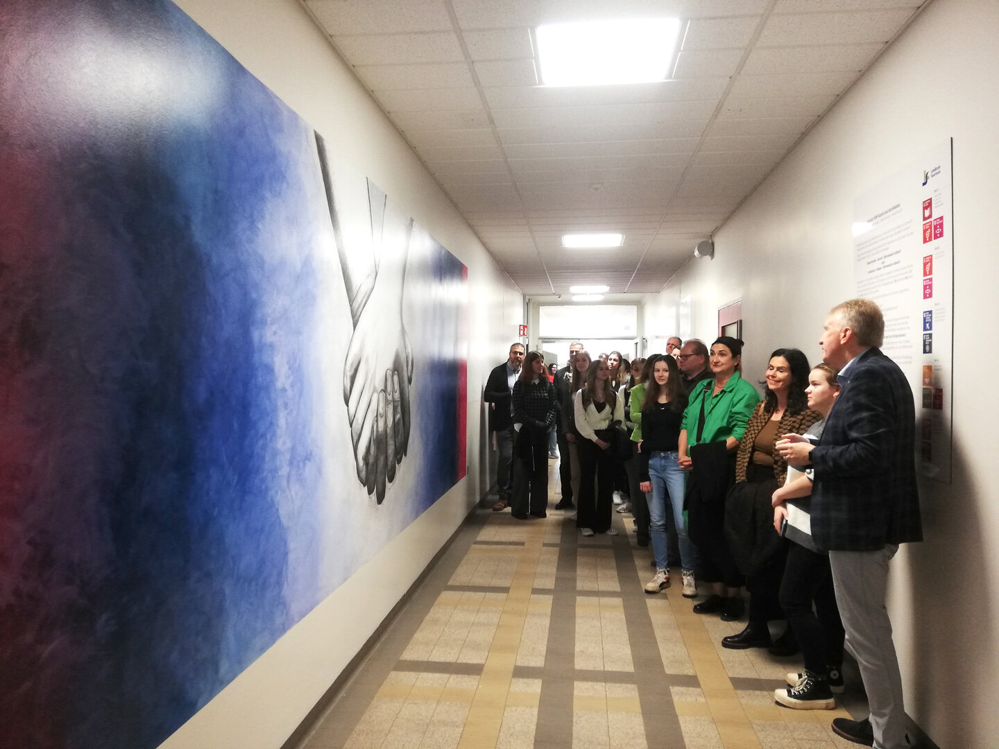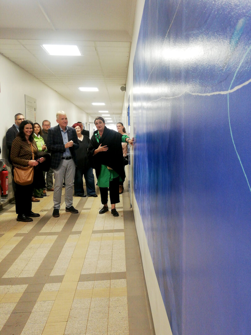 Die Kernthemen - Leben unter Wasser, Leben an Land und soziale Gerechtigkeit – setzten die Schülerinnen und Schüler unter Leitung von Natalie Sadik und der Künstlerin Lioba Amann um. Dabei erlernten die Teilnehmerinnen und Teilnehmer neue künstlerische Techniken und arbeiteten sich von kleinformatigen Skizzen über Leinwände zu den ganz großen Formaten hoch. Herausforderung beim letzten Schritt war, die Inhalte verständlich zu visualisieren und die Gemälde in Dimensionen von bis zu sechs auf drei Metern direkt auf die Wand zu malen. Keine leichte Übung, schon gar nicht, wenn vom ersten inhaltlichen Workshop mit den Schülerinnen und Schülern über das Treffen mit der leitenden Künstlerin bis zum letzten Pinselstrich gerade mal vier Wochen Zeit vergingen. „Geplant waren ursprünglich drei Bilder, es wurden 15. Ihr seid im wahrsten Sinne des Wortes über euch hinausgewachsen“, lobte Lioba Amann die Schülerinnen und Schüler. Vor und nach der Schule hätten sie gemeinsam viel Zeit investiert, um das Projekt so schnell abschließen zu können.