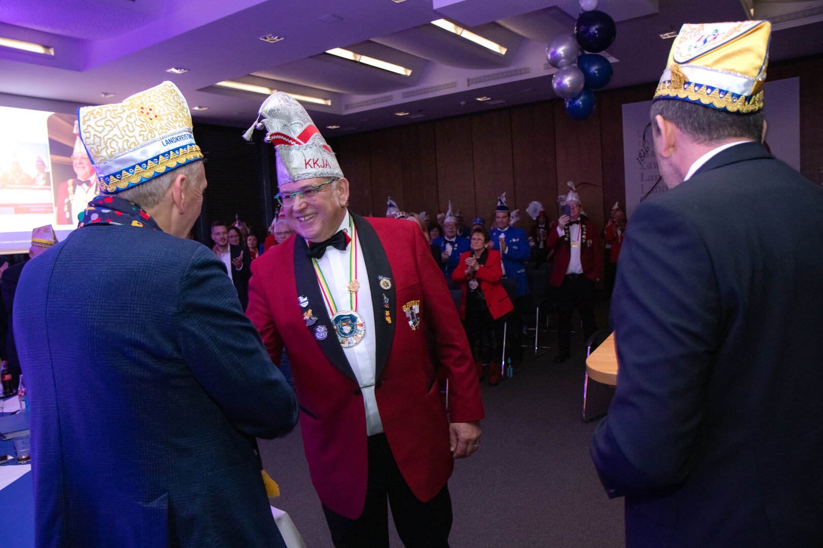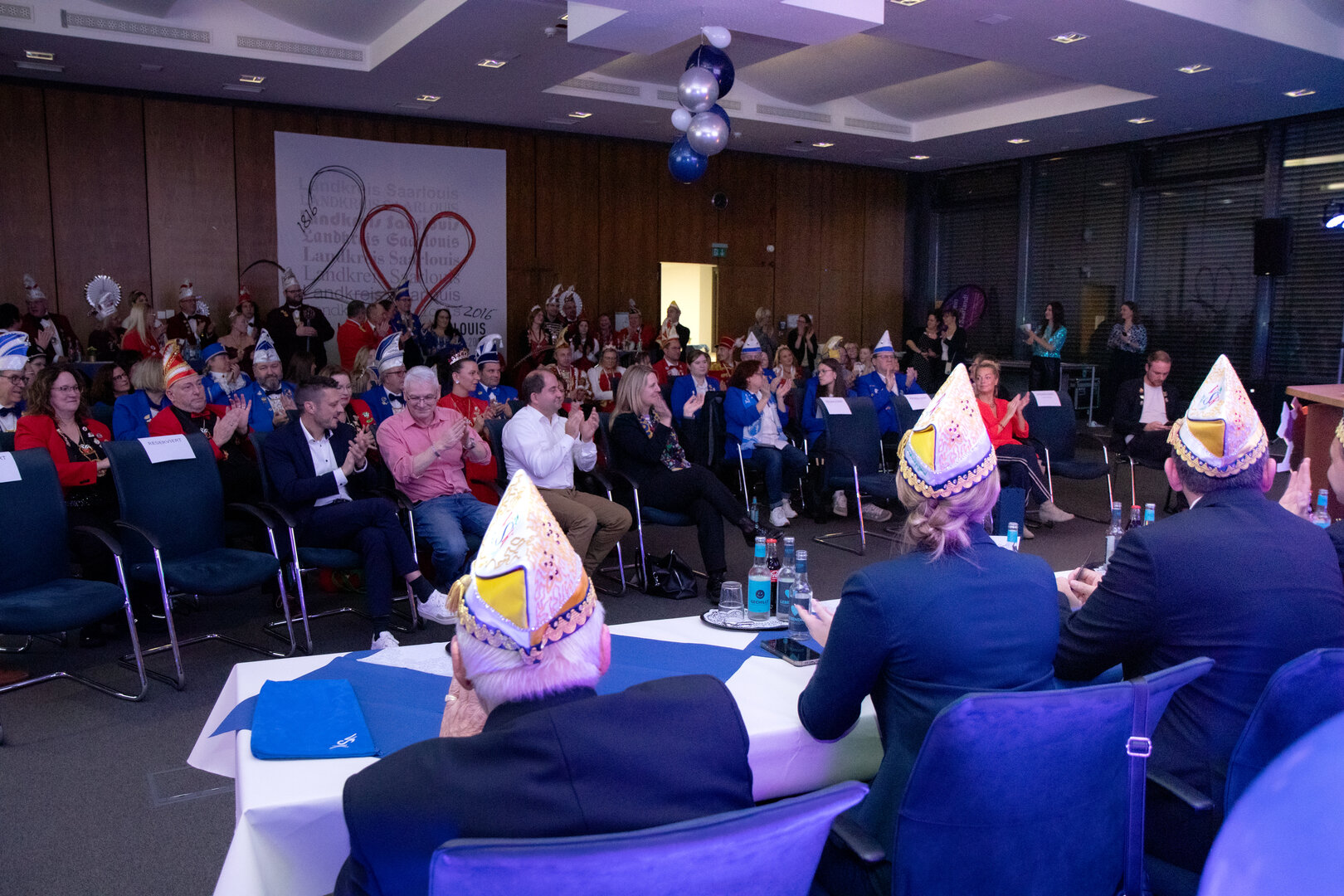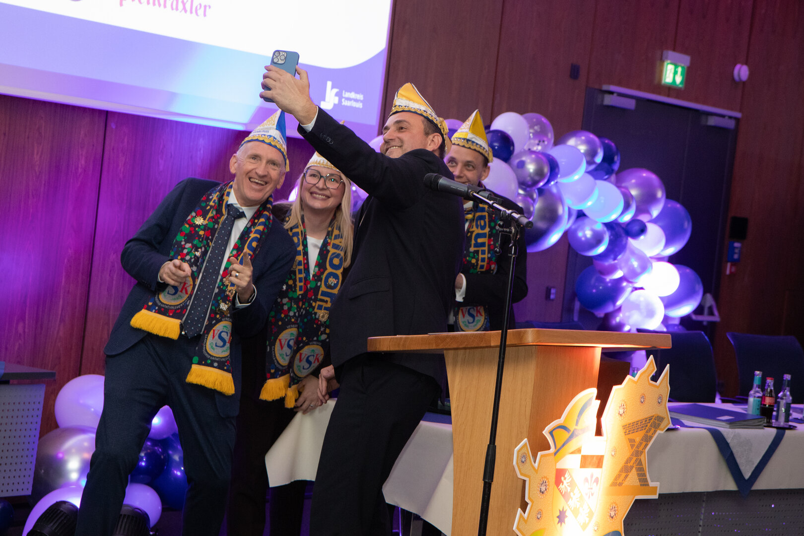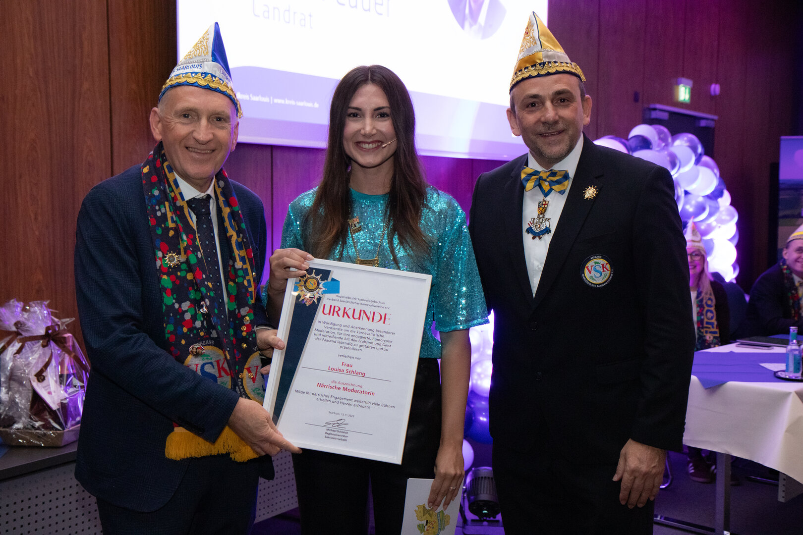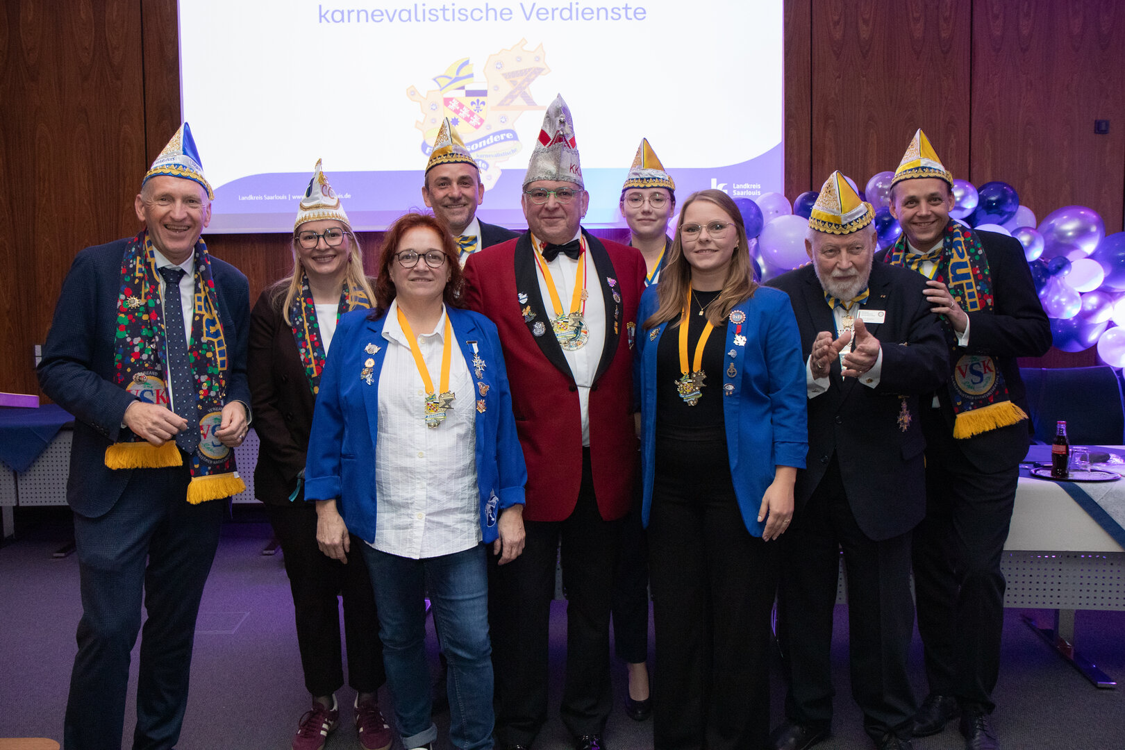 IMG_8971_klein Im Landkreis Saarlouis wurde das karnevalistische Engagement wieder mit einer besonderen Auszeichnung gewürdigt: Bereits zum dritten Mal verlieh Landrat Patrik Lauer den Ehrenorden des Landrates für besondere karnevalistische Verdienste. Im Rahmen einer feierlichen Veranstaltung im Landratsamt Saarlouis wurden in diesem Jahr drei herausragende Persönlichkeiten ausgezeichnet, die sich über viele Jahre hinweg in besonderer Weise für das närrische Brauchtum eingesetzt haben. Gut 100 Gäste aus den Reihen der Karnevalistinnen und Karnevalisten im Landkreis und darüberhinaus, aber auch Kreistagsmitglieder, Abgeordnete des Landtages und Bildungsministerin Christine Streichert-Clivot verfolgen die Veranstaltung im Großen Sitzungssaal des Landratsamtes mit Begeisterung.