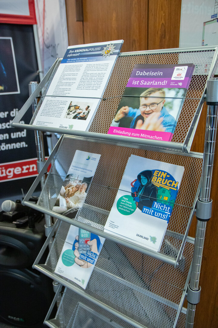 SSB2Die neuen Seniorensicherheits- beraterinnen und -berater und Landrat Patrik Lauer (ganz links) stellen das neue Equipment vor. Foto: Landkreis Saarlouis - David Nicola Schmitt Die Seniorensicherheitsberaterinnen und -berater gingen in ihren jeweiligen Ausführungen auf unterschiedliche Schwerpunkte ein und lieferten dabei wertvolle Eindrücke und Tipps für ihre Kolleginnen und Kollegen. Im Laufe der Inforunde wurden unter anderem Themen wie der Einbruchsschutz, die Sicherheit im Straßenverkehr oder aber auch Betrugsmaschen wie der Enkeltrick, Schockanrufe oder Fake-Gewinnspiele angesprochen. Hierbei konnten insbesondere die neuen Seniorensicherheitsberaterinnen und -berater vom Wissen ihrer erfahreneren Kolleginnen und Kolleginnen profitieren. So berichtete ein Teilnehmer beispielsweise davon, dass er den Senioren stets dazu rät, Infomaterial zu telefonischen Betrugsmaschen nahe am Hörer aufzubewahren – so könne man im Ernstfall besser reagieren.