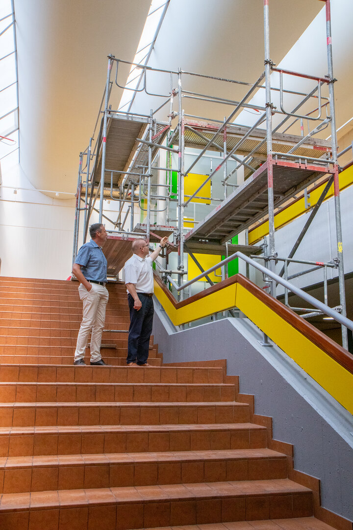 Bauamtsleiter Dirk Apitz (links) und Architekt Bernd Barbian (rechts) begutachten eine der vielen Sommer-Baustellen: An der GemS Schule an der Waldwies in Saarwellingen wurde ein Fahrstuhl installiert. Foto: Landkreis Saarlouis - David Nicola Schmitt