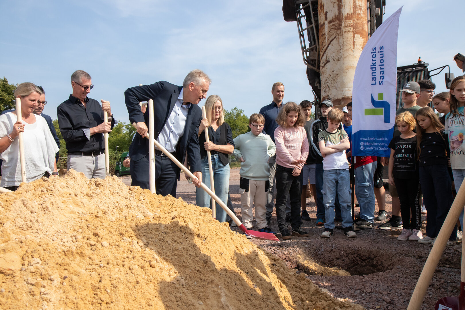 Gruppenfoto nach der gelungenen ersten Bohrung auf dem Gelände der künftigen Anne-Frank-Schule. Foto: Landkreis Saarlouis/Yannick Hoen