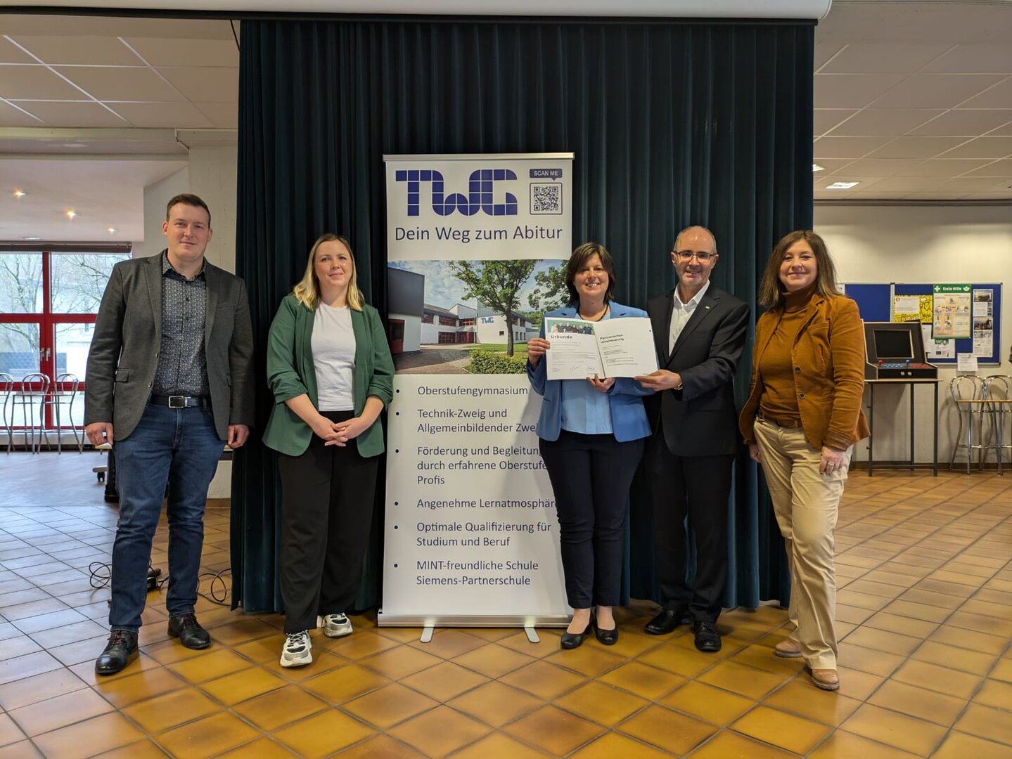 Die Siemens AG und das Technisch-Wissenschaftliche Gymnasium Dillingen (TWG) verlängern ihre 20-jährige Partnerschaft um weitere fünf Jahre. Achim Pecka, Repräsentant der Siemens-Niederlassung Saarbrücken, Linda Machwirth, Leiterin des Technisch-Wissenschaftlichen Gymnasiums, sowie Margarita Vesecky, Partnerschulbetreuerin bei Siemens, unterzeichneten den Vertrag zur umfangreichen Kooperation zwischen dem Technologieunternehmen und der Schule. Das Gymnasium verbleibt damit im Siemens-Partnerschulprogramm und ist eine von 60 Schulen in Deutschland, die von Siemens auf diese Weise gefördert wird.