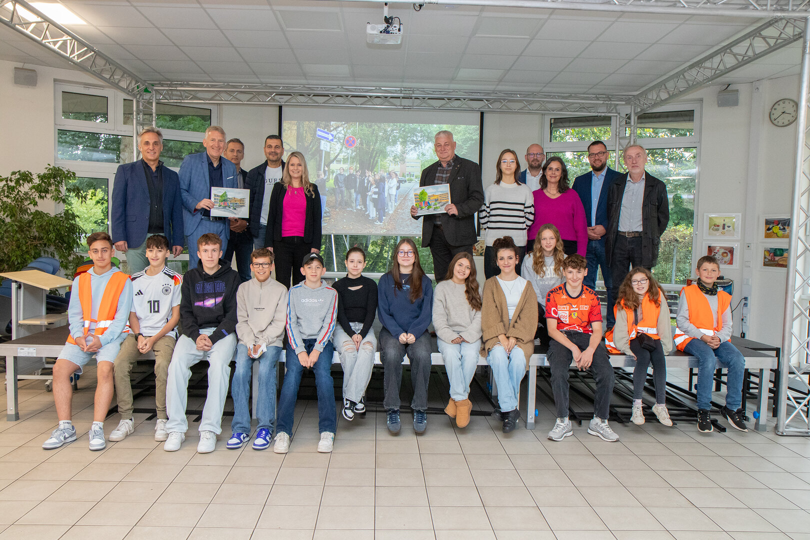 Schülerinnen und Schüler des Max-Planck-Gymnasiums Saarlouis präsentierten gemeinsam mit Schulleiter Christian Bravo Lanyi die Umsetzung der Schulwegplanung. Foto: Landkreis Saarlouis - David Nicola Schmitt