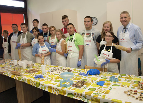 „Süße Verführung" hieß das Motto in der Küche der Waldschule in Saarwellingen. Manfred Müller, Produktionsleiter von „Trumpf Schokolade", fünf Mitarbeiter und drei Azubis zur Fachkraft für Süßwarentechnik, brachten einige Kilo Marzipan, Schokolade, Dekomaterial und alles, was man braucht, um Pralinen und köstliches Naschwerk zu zaubern, mit. Zwei Rezepte, Marzipan-Praline mit Garnierung und Nougat-Praline mit Marmelade und Crunch in Krokant-Hülsen sind nachzulesen in dem deutsch-polnischen Kochbuch, dass die polnischen Gäste zusammen mit ihren Partnerschülern, unterstützt von Margit Jungmann und ihrem Schulamtsteam, zusammengestellt haben.