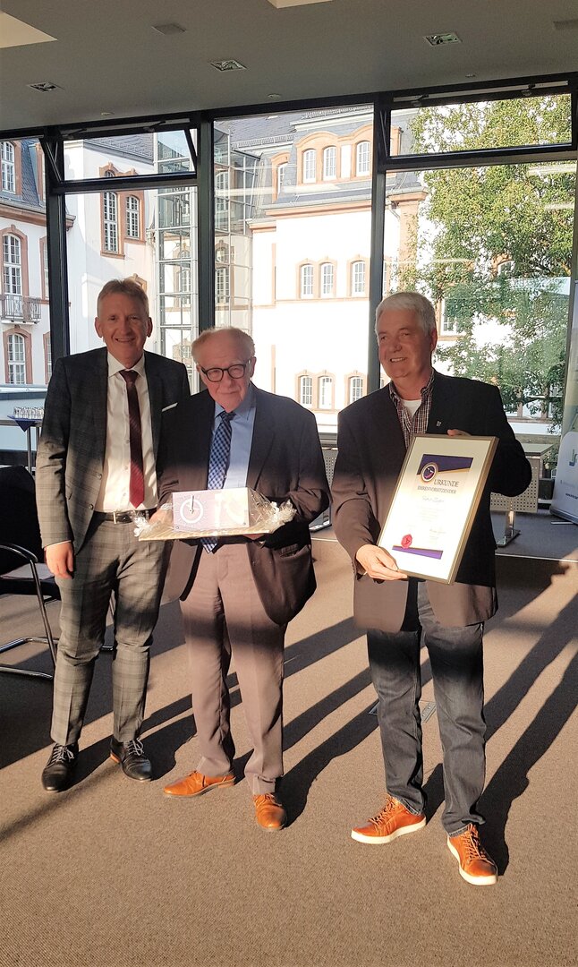 Der Vorsitzende Hermann Zenner dankte Gerd Rupp für seine jahrelange zuverlässige Arbeit als Schatzmeister. Die Versammlung ernannte zudem den Gründungsvorsitzenden Horst Ziegler, der den Verein von 2002 bis 2016 geleitet hatte, zum Ehrenvorsitzenden. Der alte und neue Vorsitzende Hermann Zenner und der Präsident des Partnerschaftsvereins, Landrat Patrik Lauer, überreichten Horst Ziegler die Ehrenurkunde und ein Präsent.