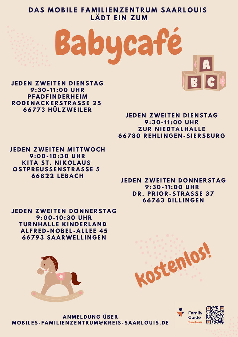 Das Angebot ist kostenlos. Aufgrund begrenzter Kapazitäten wird bei allen Terminen um vorherige Anmeldung unter mobiles-familienzentrum@kreis-saarlouis.de gebeten.
