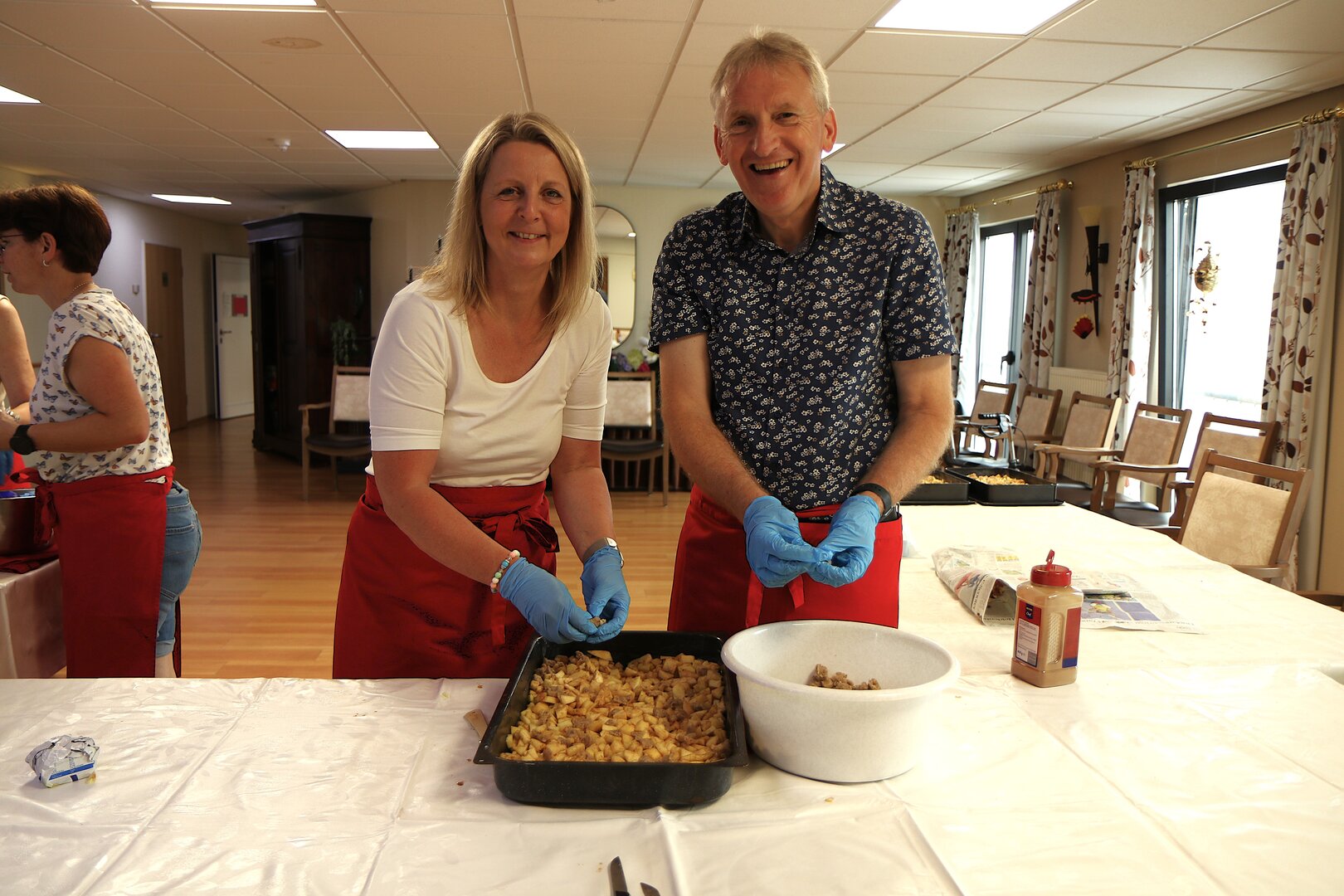 Die Erste Kreisbeigeordnete Sandra Quinten und Landrat Patrik Lauer bereiteten mit den Bewohnerinnen und Bewohnern von St. Augustin Apfelstreusel vor. Foto: Landkreis Saarlouis/Julia Brill