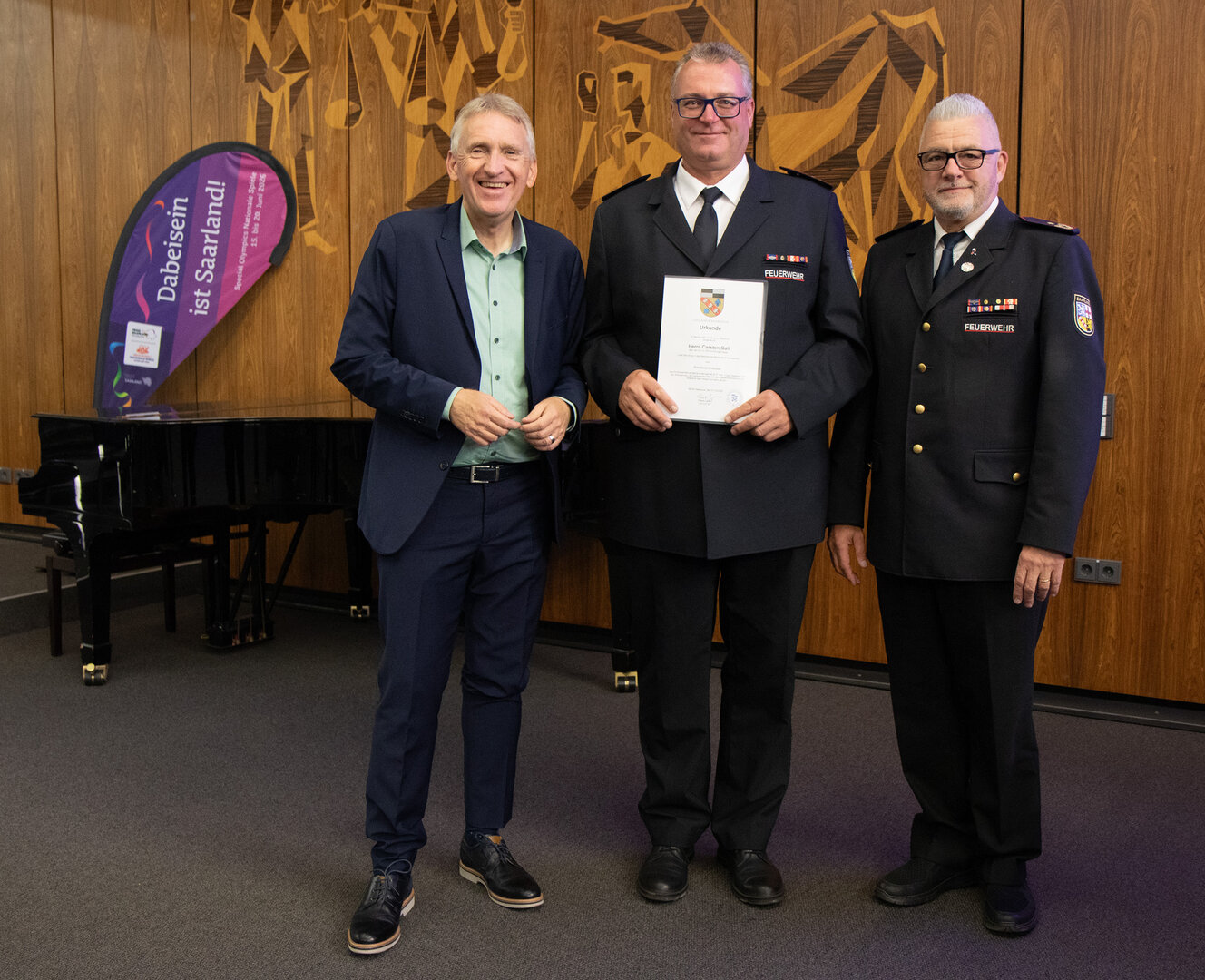 Landrat Patrik Lauer, der neue Kreisbrandmeister Carsten Gall und Kreisbrandinspekteur Bernd Paul (von links). Foto: Landkreis Saarlouis/Ulrike Paulmann