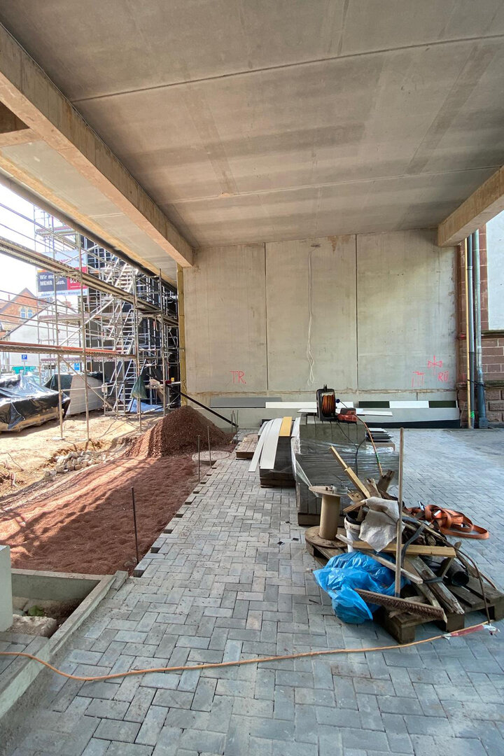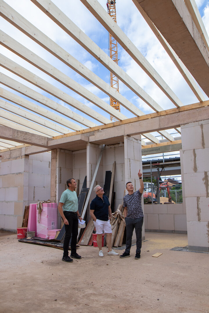 Im Rohbau des Lernzentrums an der Johannes-Gutenberg-Schule in Schwalbach, von links: Bauamtsleiter Dirk Apitz, Schulleiter Falk Staub und Projektleiter Sergej Hammel begutachten die Fortschritte. Foto: Landkreis Saarlouis - David Nicola Schmitt.