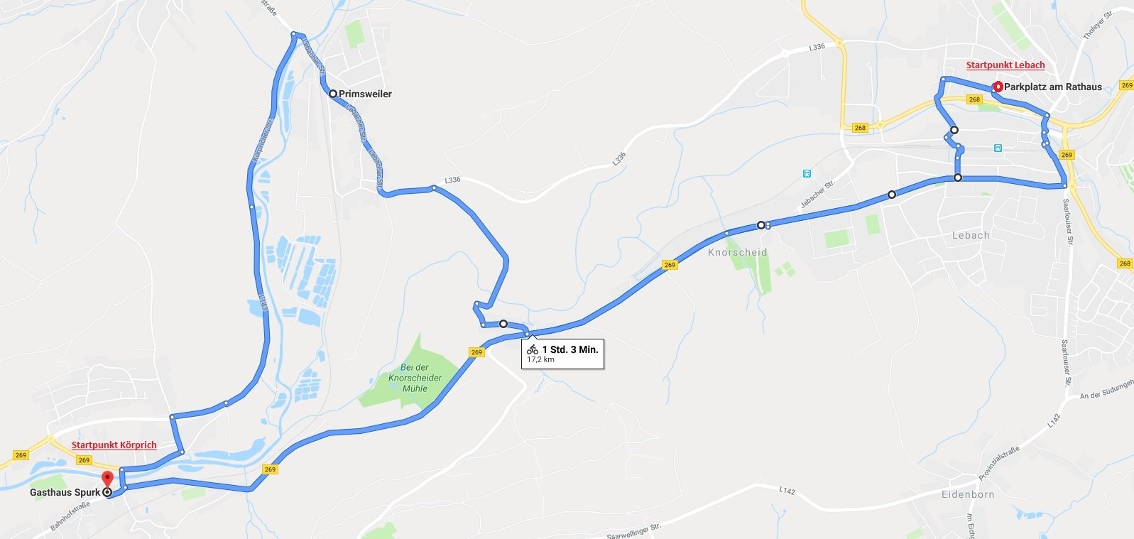 Von Körprich geht es über Knorrscheid nach Lebach. Von Lebach aus fahren die Radler gemeinsam über Primsweiler nach Körprich zur Einkehr ins Gasthaus Spurk zurück.